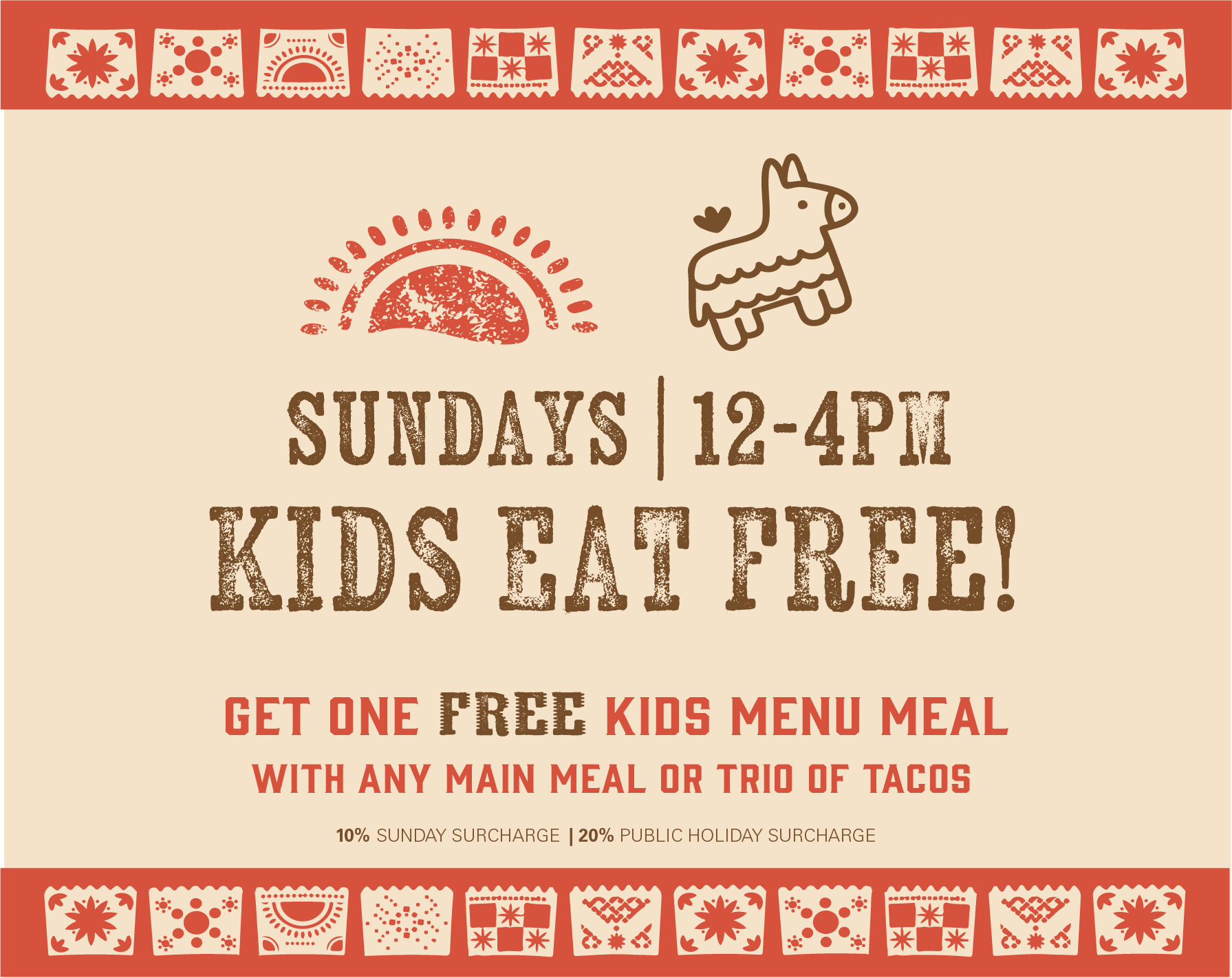 [Terms & Conditions Apply – Kids eat free with any dine-in adult ordering a Comida (main meal) or a Trio of Tacos. Offer includes one kids’ menu item per child and excludes drinks, sides, and desserts. Not valid on public holidays or in conjunction with any other offer.]